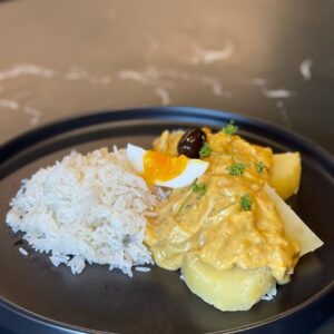 Papas cocidas lentamente en aceite, cebolla caramelizada y el toque cítrico de una mayonesa de limón casera.